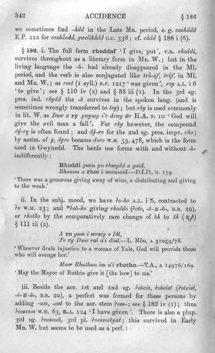 342 ACCIDENCE § 186 we sometimes find -ā́dd in the Late Mn. period, e.g. cashâdd E.P. 222 for cashā́odd, gwellhā́dd C.C. 338; cf. cā́dd § 188 i (6). § 186. i. The full form rhoddaf ‘I give, put’, v.n. rhoddi, survives throughout as a literary form in Mn. W.; but in the living language the -ẟ- had already disappeared in the Ml. period, and the verb is also conjugated like trṓ-af, trṓf, in Ml. and Mn. W.; as roet (1 syll.) R.P. 1217 ‘was given’, roy A.L. i 6 ‘to give’; see § 110 iv (2) and § 33 iii (1). In the 3rd sg. pres. ind. rhydd the -ẟ survives in the spoken lang. (and is sometimes wrongly transferred to try); but rhy is used commonly in lit. W. as Duw a ry gwymp i'r drwg ŵr H.A. F. 10 ‘God will give the evil man a fall’. For rhy however, the compound dỿ́-rɥ is often found ; and dỿ́-ro for the and sg. pres. impv. rho ; by assim. of ỿ, dỿro became doro W.M. 53, 478, which is the form used in Gwynedd. The bards use forms with and without -ẟ- indifferently: Rhoddi gwin yn rhwydd a gaid, Rhannu a rhoi i weiniaid. — D.I.D., G. 179. ‘There was a generous giving away of wine, a distributing and giving to the weak.’ ii. In the subj. mood, we have r̔o-ho A.L. i 6, contracted to r̔o W.M. 23; and *r̔oẟ-ho giving rhoddo (r̔oto, -t- ≡ -ẟ-, B.B. 29), or rhotho by the comparatively rare change of ẟh to th (≡þ) § 111 iii (2). A ro gam i wraig o Iâl, Fo ry Duw rai a'i dial. — L. Mon, A 31059/78. ‘Whoever deals injustice to a woman of Yale, God will provide those who will avenge her.’ Maer Rhuthun im a'i rhotho. T.A., A 14976/169. ‘May the Mayor of Ruthin give it [the bow] to me.’ iii. Beside the aor. 1st and 2nd sg. r̔oẟeis, r̔oẟeist (r̔oteist, -t- ≡ -ẟ-, B.B. 30), a perfect was formed for these persons by adding -um, -ost to the aor. stem r̔oes-; see 182 iv (i); thus r̔oessum W.M. 63, Ỻ.A. 124 ‘I have given’. There is also a plup. 3rd sg. r̔oessoeẟ, 3rd pl. r̔oessoeẟynt; this survived in Early Mn. W. but seems to be used as a perf.: |