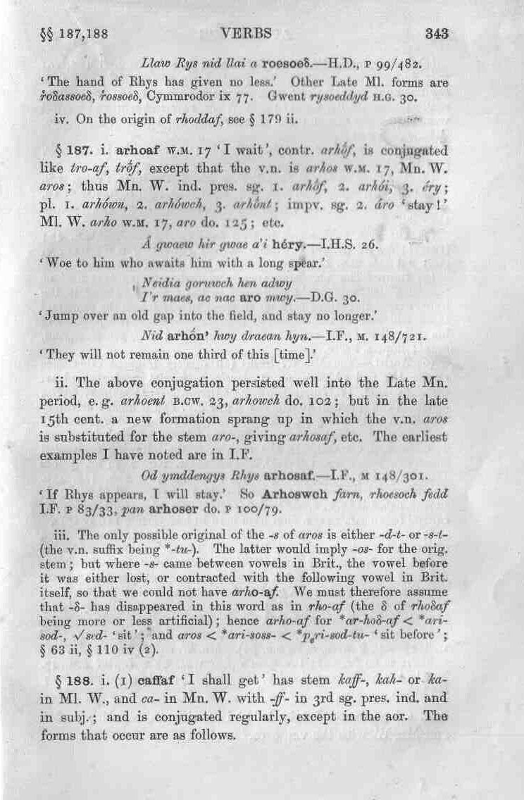 §§ 187, 188 Verbs 343 Llaw Rys nid llai a roesoeẟ.—H.D., p 99/482. ‘The hand of Rhys has given no less.’ Other Late Ml. forms are r͑oẟassoeẟ, r͑ossoeẟ, Cymmrodor ix 77. Gwent rysoeddyd h.g. 30. iv. On the origin of rhoddaf, see § 179 ii. § 187. i. arhoaf w.m. 17 ‘I wait’, contr. arhṓf, is conjugated like tro-af, trṓf, except that the v.n. is arhos w.m. 17, Mn. W. aros; thus Mn. W. ind. pres. sg. 1. arhṓf, 2. arhói, 3. éry; pl. 1. arhówn, 2. arhówch, 3. arhṓnt; impv. sg. 2. áro ‘stay!’ Ml. W. arho w.m. 17, aro do. 125; etc. Â gwaew hir gwae a’i héry.—I.H.S. 26. ‘Woe to him who awaits him with a long spear.’ Neidia goruwch hen adwy I’r maes, ac nac aro mwy.—D.G. 30. ‘Jump over an old gap into the field, and stay no longer.’ Nid arhṓn’ hwy draean hyn.—I.F., m. 148/721. ‘They will not remain one third of this [time].’ ii. The above conjugation persisted well into the Late Mn. period, e.g. arhoent b.cw. 23, arhowch do. 102; but in the late 15th cent, a new formation sprang up in which the v.n. aros is substituted for the stem aro‑, giving arhosaf, etc. The earliest examples I have noted are in I.F. Od ymddengys Rhys arhosaf.—I.F., m 148/301. ‘If Rhys appears, I will stay.’ So Arhoswch farn, rhoesoch fedd I.F. p 83/33, pan arhoser do. P 100/79. iii. The only possible original of the ‑s of aros is either ‑d‑t- or ‑s‑t- (the v.n. suffix being *‑tu‑). The latter would imply ‑os- for the orig. stem; but where ‑s- came between vowels in Brit., the vowel before it was either lost, or contracted with the following vowel in Brit. itself, so that we could not have arho-af. We must therefore assume that ‑ẟ- has disappeared in this word as in rho-af (the ẟ of rhoẟaf being more or less artificial); hence arho-af for *ar-hoẟ-af < *ari-sod‑, √sed- ‘sit’; and aros < *ari-soss- < *pₑri-sod-tu- ‘sit before’; § 63 ii, § 110 iv (2). § 188. i. (1) caffaf ‘I shall get’ has stem kaff‑, kah- or ka- in Ml. W., and ca- in Mn. W. with ‑ff- in 3rd sg. pres. ind. and in subj.; and is conjugated regularly, except in the aor. The forms that occur are as follows. |