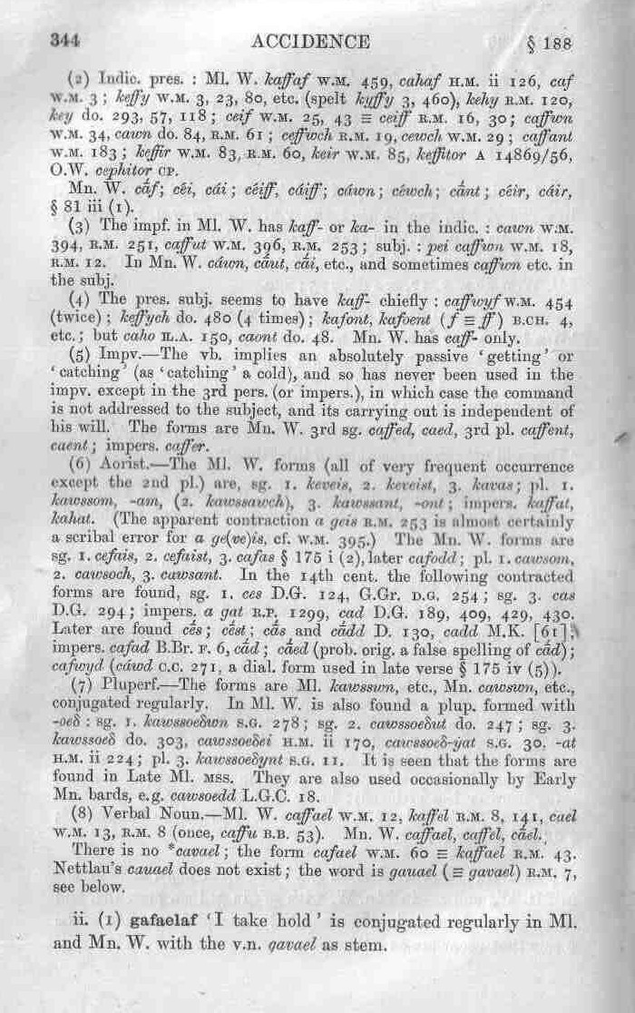 344 Accidence § 188 (2) Indic. pres.: Ml. W. kaffaf w.m. 459, cahaf h.m. ii 126, caf w.m. 3; keffy w.m. 3, 23, 80, etc. (spelt kyffy 3, 460), kehy r.m. 120, key do. 293, 57, 118; ceif w.m. 25, 43 ≡ ceiff r.m. 16, 30; caffwn w.m. 34, cawn do. 84, r.m. 61; ceffwch r.m. 19, cewch w.m. 29; caffant w.m. 183; keffir w.m. 83, r.m. 60, keir w.m. 85, keffitor a 14869/56, O.W. cephitor CP. Mn. W. cāf; céi, cái; céiff, cáiff; cáwn; cewch; cā́nt; céir, cáir, § 81 iii (1). (3) The impf. in Ml. W. has kaff- or ka- in the indic.: cawn w.m. 394, r.m. 251, caffut w.m. 396, r.m. 253; subj.: pei caffwn w.m. 18, r.m. 12. In Mn. W. cáwn, cā́ut, cā́i, etc., and sometimes caffwn etc. in the subj. (4) The pres. subj. seems to have kaff- chiefly: caffwyf w.m. 454 (twice); keffych do. 480 (4 times); kafont, kafoent (f ≡ ff) b.ch. 4, etc.; but caho Ỻ.A. 150, caont do. 48. Mn. W. has caff- only. (5) Impv.—The vb. implies an absolutely passive ‘getting’ or ‘catching’ (as ‘catching’ a cold), and so has never been used in the impv. except in the 3rd pers. (or impers.), in which case the command is not addressed to the subject, and its carrying out is independent of his will. The forms are Mn. W. 3rd sg. caffed, caed, 3rd pl. caffent, caent; impers. caffer. (6) Aorist.—The Ml. W. forms (all of very frequent occurrence except the 2nd pl.) are, sg. 1. keveis, 2. keveist, 3. kavas; pl. 1. kawssom, ‑am, (2. kawssawch), 3. kawssant, ‑ont; impers. kaffat, kahat. (The apparent contraction a geis r.m. 253 is almost certainly a scribal error for a ge(ve)is, cf. w.m. 395.) The Mn. W. forms are sg. 1. cefais, 2. cefaist, 3. cafas § 175 i (2), later cafodd; pl. 1. cawsom, 2. cawsoch, 3. cawsant. In the 14th cen., the following contracted forms are found, sg. 1. ces D.G. 124, G.Gr. d.g. 254; sg. 3. cas D.G. 294; impers. a gat r.p. 1299, cad D.G. 189, 409, 429, 430. Later are found cḗs; cḗst; cā́s and cā́dd D. 130, cadd M.K. [61]; impers. cafad B.Br. f. 6, cā́d; cā́ed (prob. orig. a false spelling of cā́d); cafwyd (cáwd c.c. 271, a dial, form used in late verse § 175 iv (5)). (7) Pluperf.—The forms are Ml. kawsswn, etc., Mn. cawswn, etc., conjugated regularly. In Ml. W. is also found a plup. formed with ‑oeẟ: sg. 1. kawssoeẟwn s.g. 278; sg. 2. cawssoeẟut do. 247; sg. 3. kawssoeẟ do. 303, cawssoeẟei h.m. ii 170, cawssoeẟ-ẏat s.g. 30, ‑at h.m. ii 224; pl. 3. kawssoeẟynt s.g. 11. It is seen that the forms are found in Late Ml. mss. They are also used occasionally by Early Mn. bards, e.g. cawsoedd L.G.C. 18. (8) Verbal Noun.—Ml. W. caffael w.m. 12, kaffel r.m. 8, 141, cael w.m. 13, r.m. 8 (once, caffu b.b. 53). Mn. W. caffael, caffel, cā́el. There is no *cavael; the form cafael w.m. 60 ≡ kaffael r.m. 43. Nettlau’s cauael does not exist; the word is gauael (≡ gavael) r.m. 7, see below. ii. (1) gafaelaf ‘I take hold’ is conjugated regularly in Ml. and Mn. W. with the v.n. gavael as stem. |