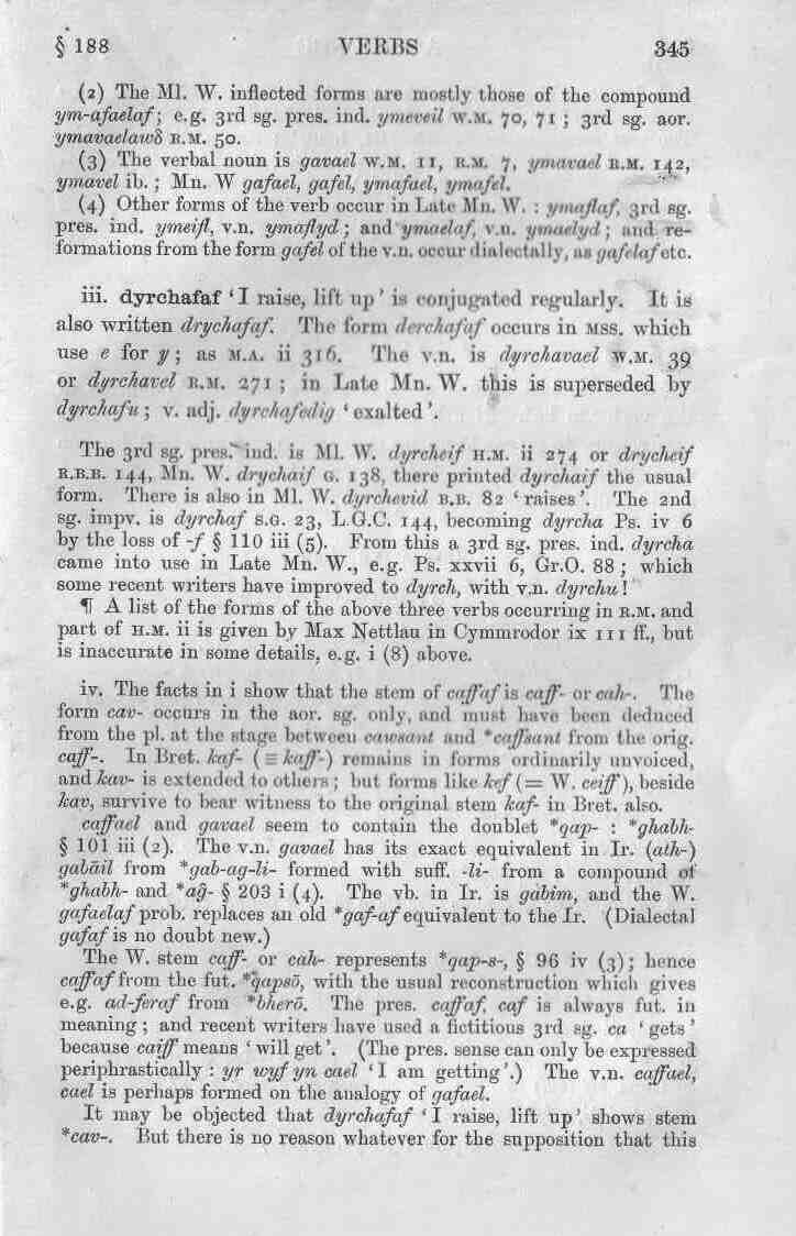 § 188 Verbs 345 (2) The Ml. W. inflected forms are mostly those of the compound ym-afaelaf; e.g. 3rd sg. pres. ind. ymeveil w.m. 70, 71; 3rd sg. aor. ymavaelawẟ r.m. 50. (3) The verbal noun is gavael w.m. 11, r.m. 7, ymavael r.m. 142, ymavel ib.; Mn. W gafael, gafel, ymafael, ymafel. (4) Other forms of the verb occur in Late Mn. W.: ymaflaf, 3rd sg. pres. ind. ymeifl, v.n. ymaflyd; and ymaelaf, v.n. ymaelyd; and re-formations from the form gafel of the v.n. occur dialectally, as gafelaf etc. iii. dyrchafaf ‘I raise, lift up’ is conjugated regularly. It is also written drychafaf. The form derchafaf occurs in mss. which use e for ỿ as m.a. ii 316. The v.n. is dyrchavael w.m. 39 or dyrchavel r.m. 271; in Late Mn. W. this is superseded by dyrchafu; v. adj. dyrchafedig ‘exalted’. The 3rd sg. pres. ind. is Ml. W. dyrcheif h.m. ii 274 or drycheif r.b.b. 144, Mn. W. drychaif g. 138, there printed dyrchaif the usual form. There is also in Ml. W. dyrchevid b.b. 82 ‘raises’. The 2nd sg. impv. is dyrchaf s.g. 23, L.G.C. 144, becoming dyrcha Ps. iv 6 by the loss of ‑f § 110 iii (5). From this a 3rd sg. pres. ind. dyrcha came into use in Late Mn. W., e.g. Ps. xxvii 6, Gr.O. 88; which some recent writers have improved to dyrch, with v.n. dyrchu! ¶ A list of the forms of the above three verbs occurring in r.m. and part of h.m. ii is given by Max Nettlau in Cymmrodor ix 111 ff., but is inaccurate in some details, e.g. i (8) above. iv. The facts in i show that the stem of caffaf is caff- or cah‑. The form cav- occurs in the aor. sg. only, and must have been deduced from the pl. at the stage between cawsant and *caffsant from the orig. caff‑. In Bret. kaf- (≡ kaff‑) remains in forms ordinarily unvoiced, and kav- is extended to others; but forms like kef (= W. ceiff), beside kav, survive to bear witness to the original stem kaf- in Bret. also. caffael and gavael seem to contain the doublet *qap‑: *ꬶhabh- § 101 iii (2). The v.n. gavael has its exact equivalent in Ir. (ath‑)gabāil from *gab-ag-li- formed with suff. ‑li- from a compound of *ꬶhabh- and *ag̑- § 203 i (4). The vb. in Ir. is gabim, and the W. gafaelaf prob. replaces an old *gaf-af equivalent to the Ir. (Dialectal gafaf is no doubt new.) The W. stem caff- or cah- represents *qap‑s‑, § 96 iv (3); hence caffaf from the fut. *qapsō, with the usual reconstruction which gives e.g. ad-feraf from *bherō. The pres. caffaf, caf is always fut. in meaning; and recent writers have used a fictitious 3rd sg. ca ‘gets’ because caiff means ‘will get’. (The pres. sense can only be expressed periphrastically: yr wyf yn cael ‘I am getting’.) The v.n. caffael, cael is perhaps formed on the analogy of gafael. It may be objected that dyrchafaf ‘I raise, lift up’ shows stem *cav‑. But there is no reason whatever for the supposition that this |