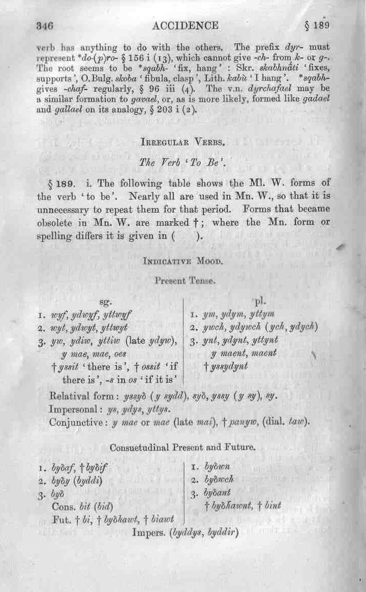 346 Accidence § 189 verb has anything to do with the others. The prefix dyr- must represent *do-(p)ro- § 156 i (13), which cannot give ‑ch- from k- or g‑. The root seems to be *sqabh- ‘fix, hang’: Skr. skabhnā́ti ‘fixes, supports’, O.Bulg. skoba ‘fibula, clasp’, Lith. kabù ‘I hang’. *sqabh- gives ‑chaf- regularly, § 96 iii (4). The v.n. dyrchafael may be a similar formation to gavael, or, as is more likely, formed like gadael and gallael on its analogy, § 203 i (2). Irregular Verbs. The Verb ‘To Be’. § 189. i. The following table shows the Ml. W. forms of the verb ‘to be’. Nearly all are used in Mn. W., so that it is unnecessary to repeat them for that period. Forms that became obsolete in Mn. W. are marked †; where the Mn. form or spelling differs it is given in ( ). Indicative Mood. Present Tense.