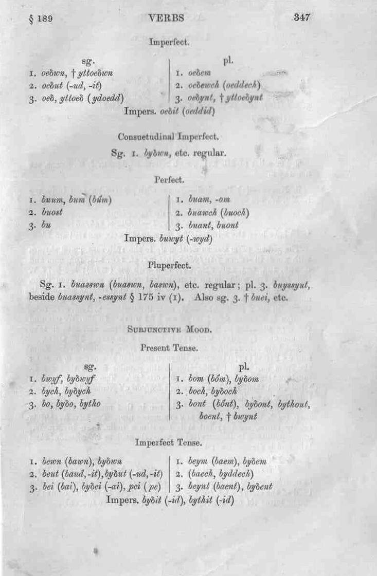 Consuetudinal Imperfect. Sg. 1. byẟwn, etc. regular. Perfect.