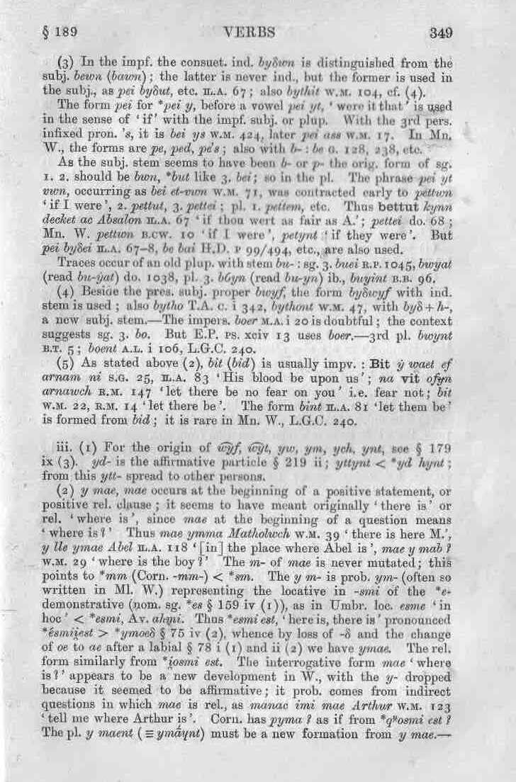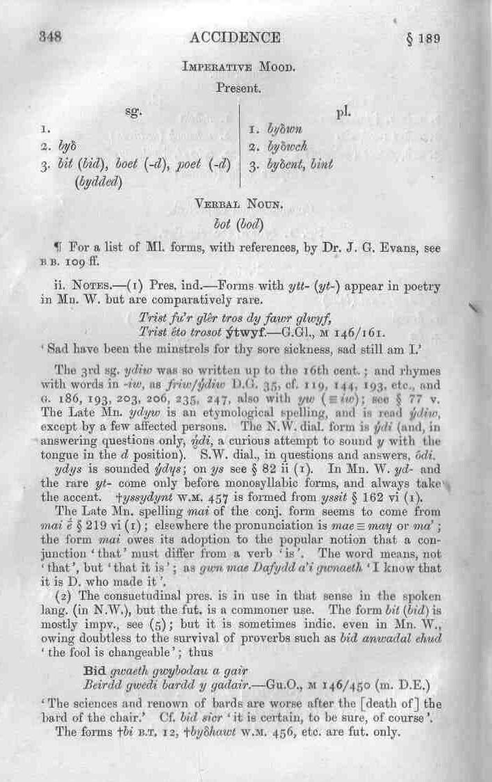 . Verbal Noun. bot (bod) ¶ For a list of Ml. forms, with references, by Dr. J. G. Evans, see bb. 109 ff. ii. Notes.—(1) Pres. ind.—Forms with ytt- (yt‑) appear in poetry in Mn. W. but are comparatively rare. Trist fu’r glêr tros dy fawr glwyf, Trist éto trosot ýtwyf.—G.G1., m 146/161. ‘Sad have been the minstrels for thy sore sickness, sad still am I.’ The 3rd sg. ydiw was so written up to the 16th cent.; and rhymes with words in ‑iw, as friw/ýdiw D.G. 35, cf. 119, 144, 193, etc., and g. 186, 193, 203, 206, 235, 247, also with yw (≡ iw); see § 77 v. The Late Mn. ydyw is an etymological spelling, and is read ỿ́diw, except by a few affected persons. The N.W. dial. form is ỿ́di (and, in answering questions only, ń̥di, a curious attempt to sound ỿ with the tongue in the d position). S.W. dial., in questions and answers, ódi. ydys is sounded ỿ́dɥs; on ys see § 82 ii (1). In Mn. W. ỿd- and the rare ỿt- come only before monosyllabic forms, and always take the accent, †yssydynt w.m. 457 is formed from yssit § 162 vi (1). The Late Mn. spelling mai of the conj, form seems to come from mai ḗ § 219 vi (1); elsewhere the pronunciation is mae ≡ maɥ or ma’; the form mai owes its adoption to the popular notion that a conjunction ‘that’ must differ from a verb ‘is’. The word means, not ‘that’, but ‘that it is’; as gwn mae Dafydd a’i gwnaeth ‘I know that it is D. who made it’. (2) The consuetudinal pres. is in use in that sense in the spoken lang. (in N.W.), but the fut. is a commoner use. The form bit (bid) is mostly impv., see (5); but it is sometimes indic. even in Mn. W., owing doubtless to the survival of proverbs such as bid anwadal ehud ‘the fool is changeable’; thus Bid gwaeth gwybodau a gair Beirdd gwedi bardd y gadair.—Gu.O., M 146/450 (m. D.E.) ‘The sciences and renown of bards are worse after the [death of] the bard of the chair.’ Cf. bid sicr ‘it is certain, to be sure, of course’. The forms †bi b.t. 12, †byẟhawt w.m. 456, etc. are fut. only. |